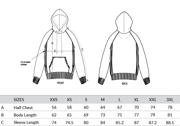 Raglan sleeves. Double-layered hood in self-fabric. Kangaroo pocket at front. 1x1 ribs at sleeve cuffs and bottom hem. 1x1 rib side panels. 1x1 rib bindings at pocket openings. Double-needle topstitches at the collar, sleeve cuffs and bottom hem. Three-needle flatlock stitches at raglan seam and side panel seams. Inside herringbone back neck tape. Self-fabric half moon at the back neck.